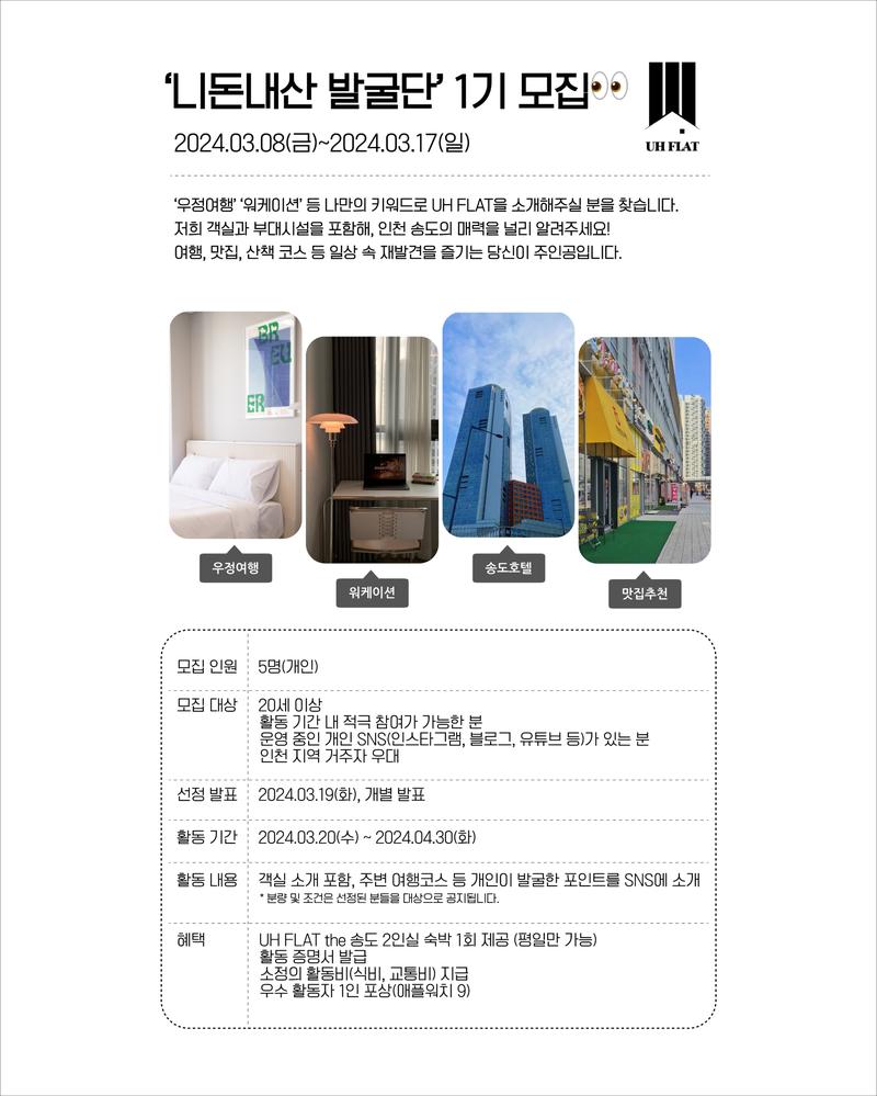 - UH FLAT the 송도에서의 경험, 주변 맛집, 카페, 산책코스 등 자신 있는 주제로 개인이 발굴한 포인트들을 SNS에 소개.(분량 및 조건은 선정된 '니돈내산 발굴단' 분들을 대상으로 공지됩니다.)