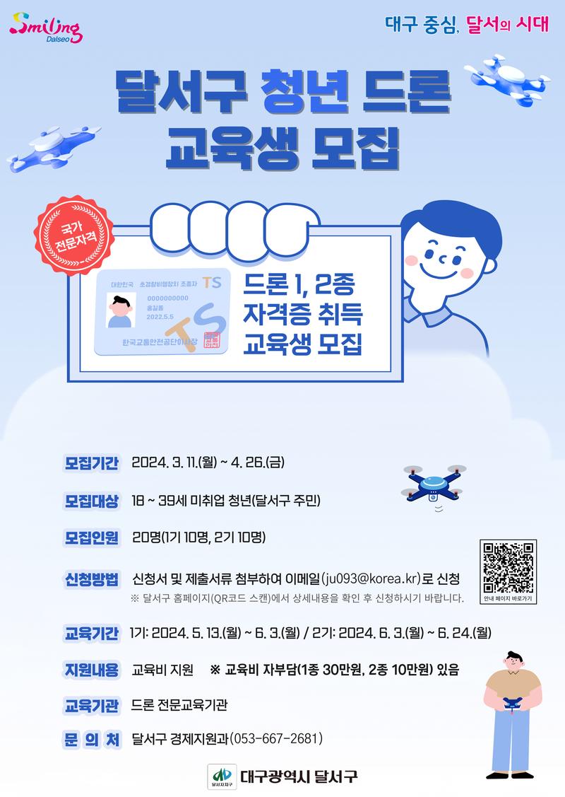 ○ 모집대상: 대구 달서구 18~39세 미취업청년 중 드론 분야에 관심이 있는 자