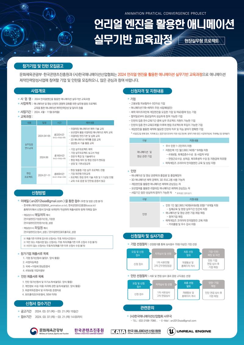 문화체육관광부·한국콘텐츠진흥원과 (사)한국애니메이션산업협회는 2024 언리얼 엔진을 활용한 애니메이션 실무기반 교육과정으로 애니메이션 제작인력양성사업에 참여할 기업 및 인턴을 모집하오니, 많은 관심과 참여 바랍니다.