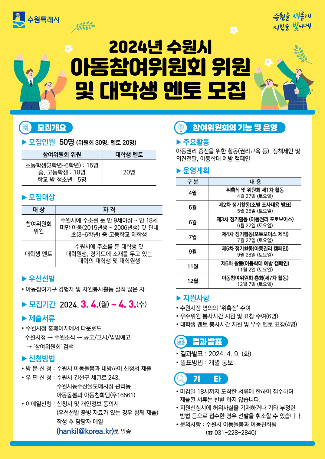 2024 수원시 아동참여위원회 대학생 멘토 (굿네이버스 아동권리모니터링단 서포터즈) 모집!!