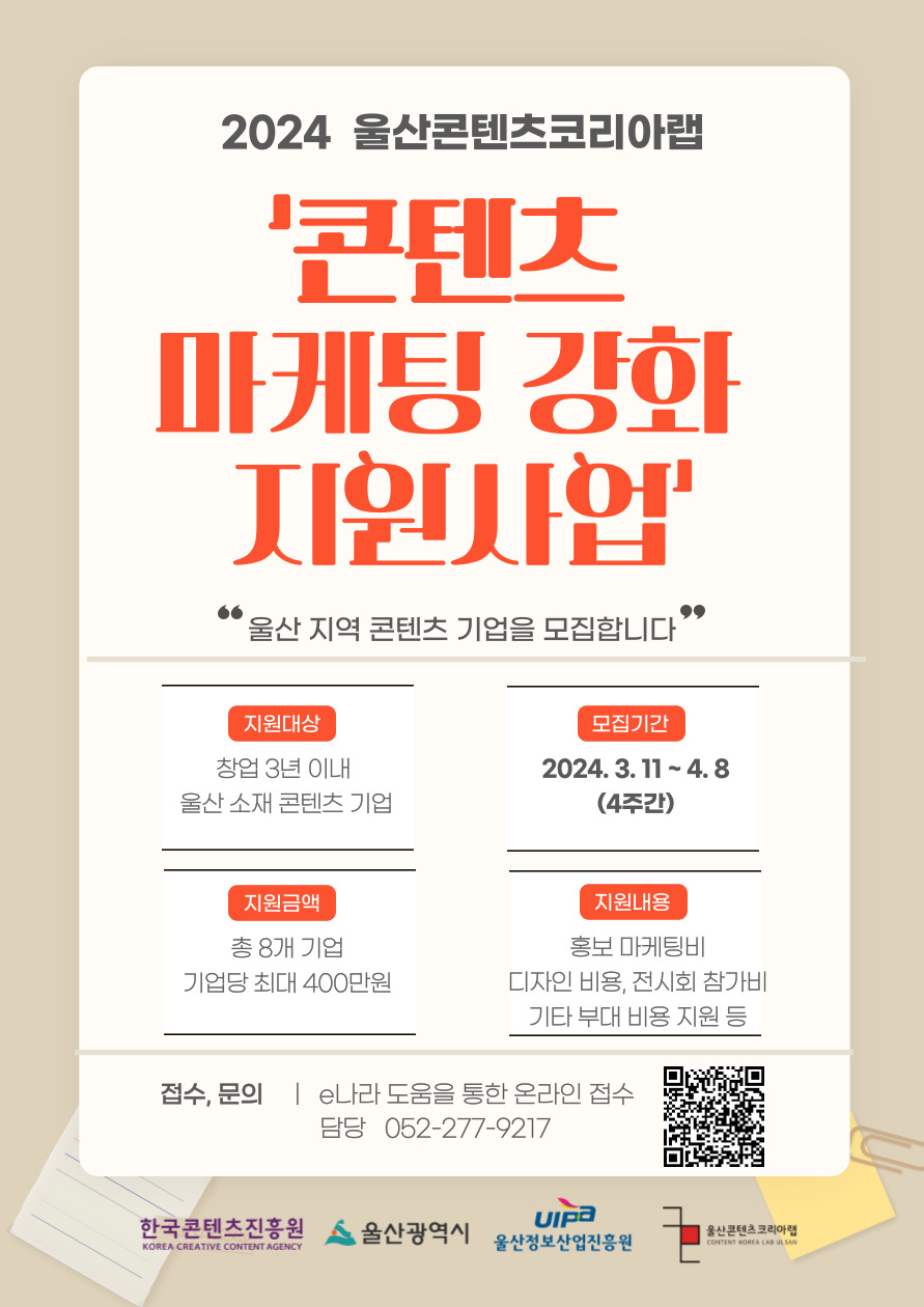 울산콘텐츠코리아랩에서 진행하는 마케팅 지원 사업 참여 기업을 모집 합니다 !