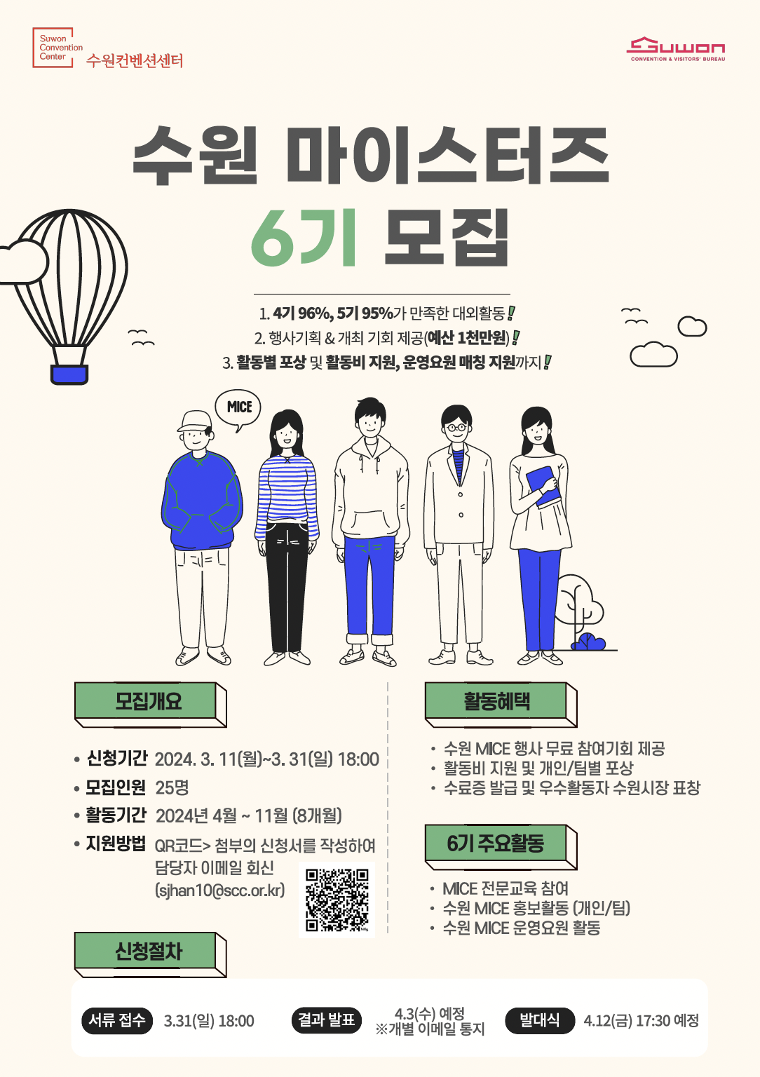 홈페이지 참조 (https://www.scc.or.kr/2024/03/07/수원-마이스터즈miceters-6기-모집-공고/)