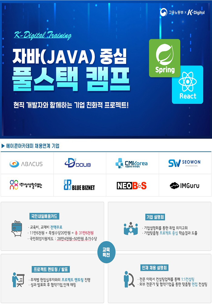 교육비용 : K-Digital 전액국비지원(국가기간.전략산업훈련 취업과정)