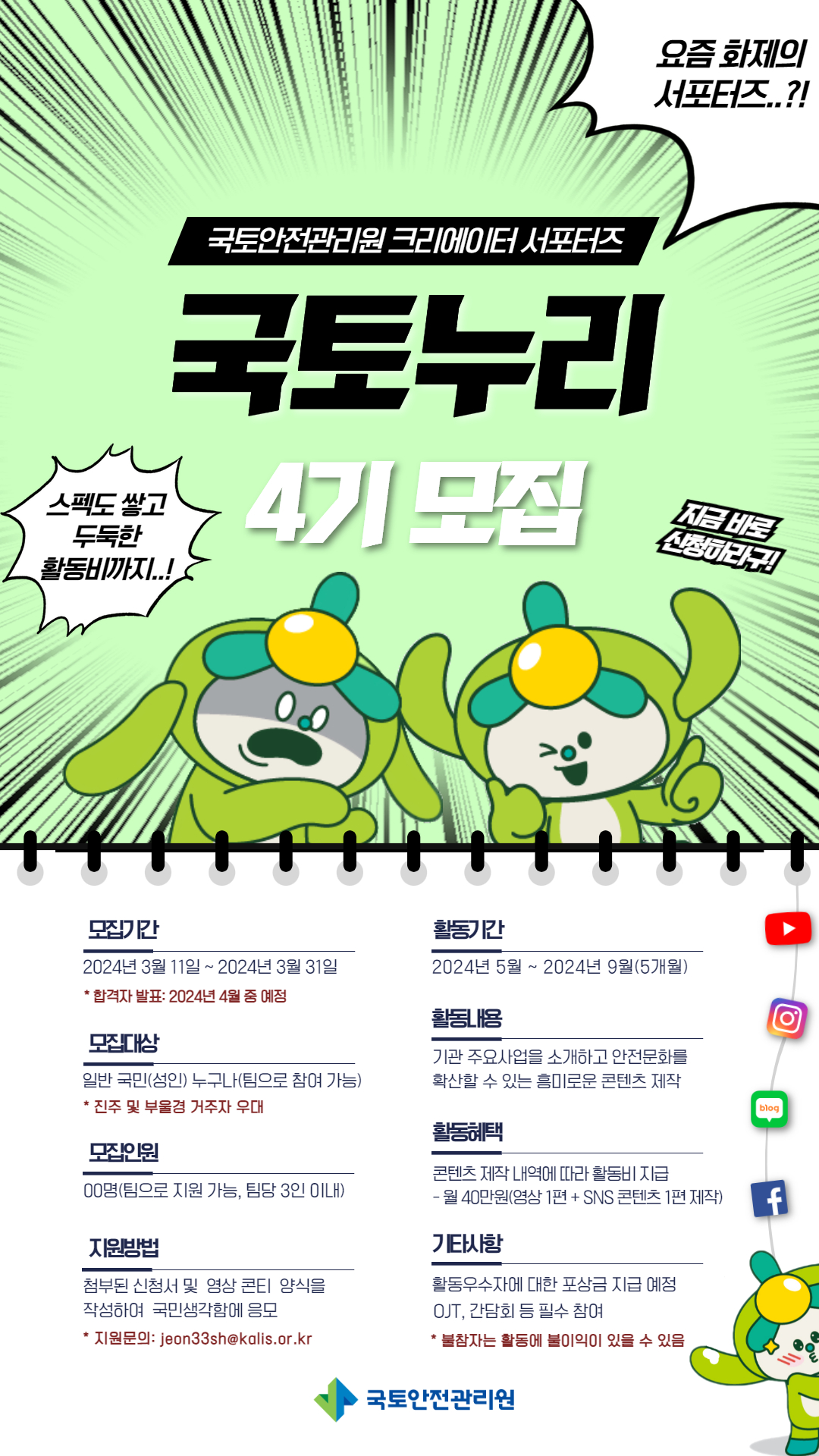 ㅇ 활동내용 : 국토안전관리원의 역할 및 각종 안전(건설, 시설, 생활)과 관련된 흥미롭고 주목성 강한 콘텐츠 제작(매월 영상 1편 + SNS 콘텐츠(카드뉴스, 웹툰, 블로그 포스팅 등) 1편 제작)