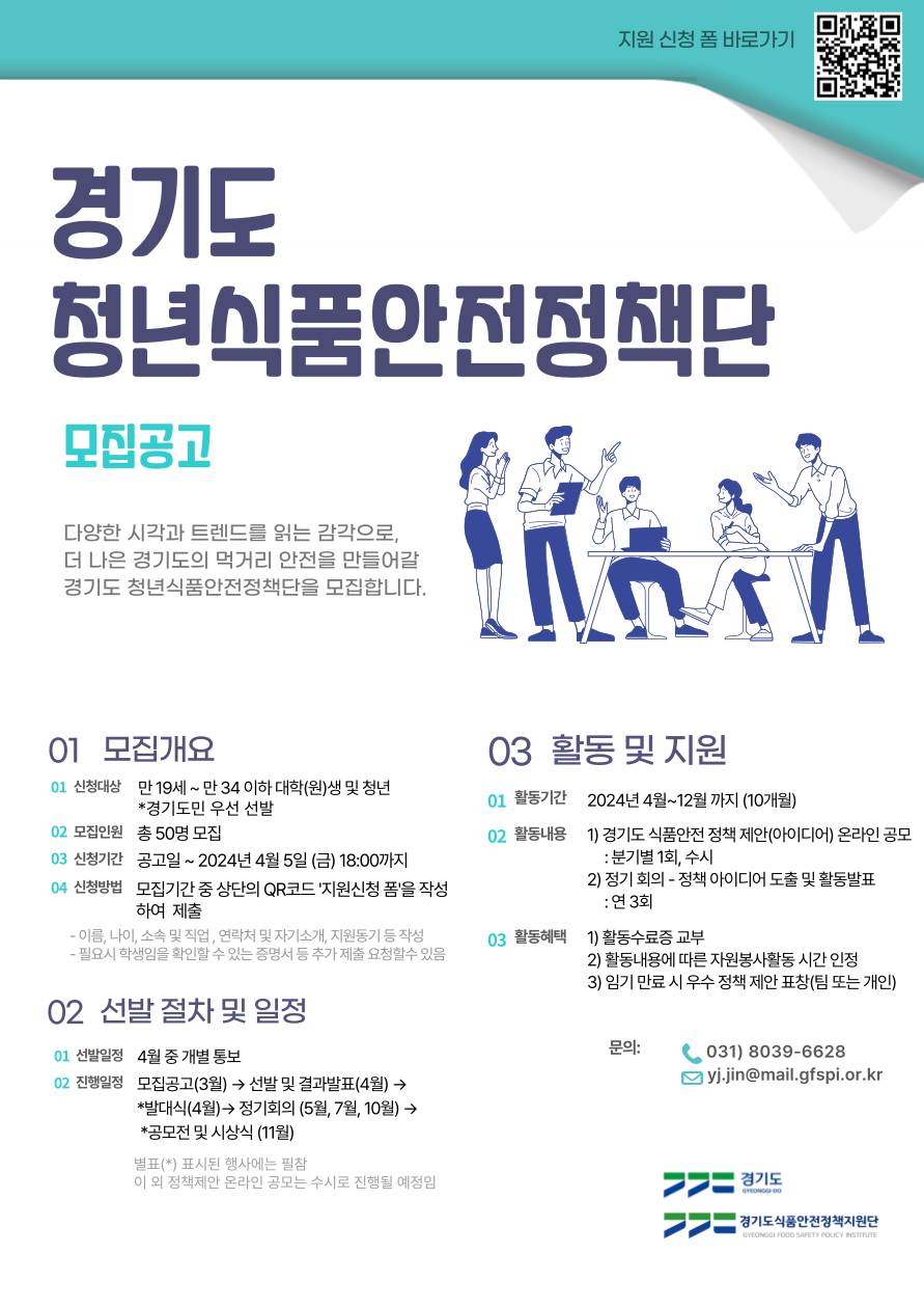 경기도 청년식품안전정책단에서는 다양하게 변화하는 식품트렌드를 바탕으로 하여 청년들의 경기도 식품안전 정책개발에 주도적으로 참여토록 하고자 아래와 같이 “2024년도 경기도 청년식품안전정책단”을 모집하오니, 청년들의 많은 관심과 지원, 참여 바랍니다.