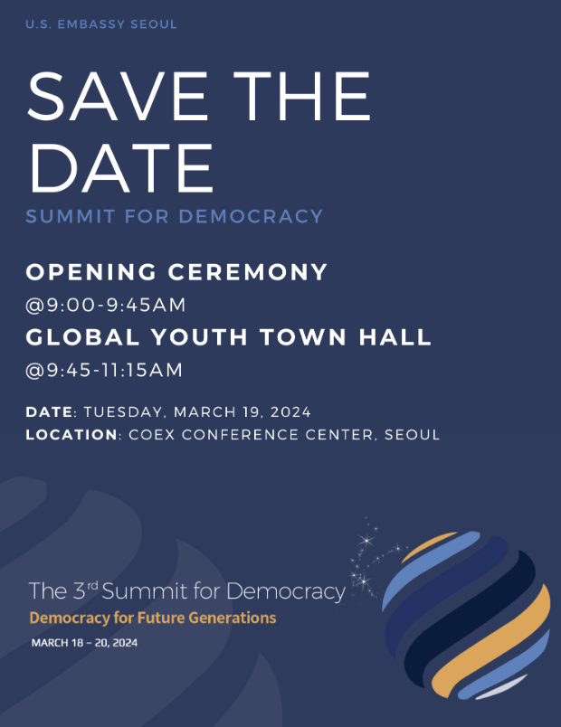 주한미국대사관은 3월 19일 (화), 한국 정부가 개최하는 ‘제3차 민주주의 정상 회의’ 개막식과 글로벌 청년타운홀에 청년 여러분들을 초청하고자 합니다.