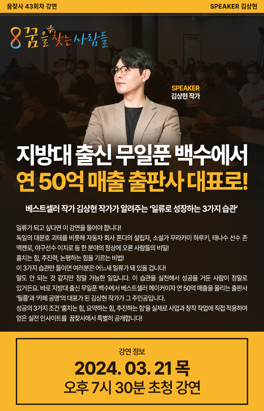 강연은 3월 21일 목요일 오후 7시 30분 꿈찾사 강연장에서 시작합니다!