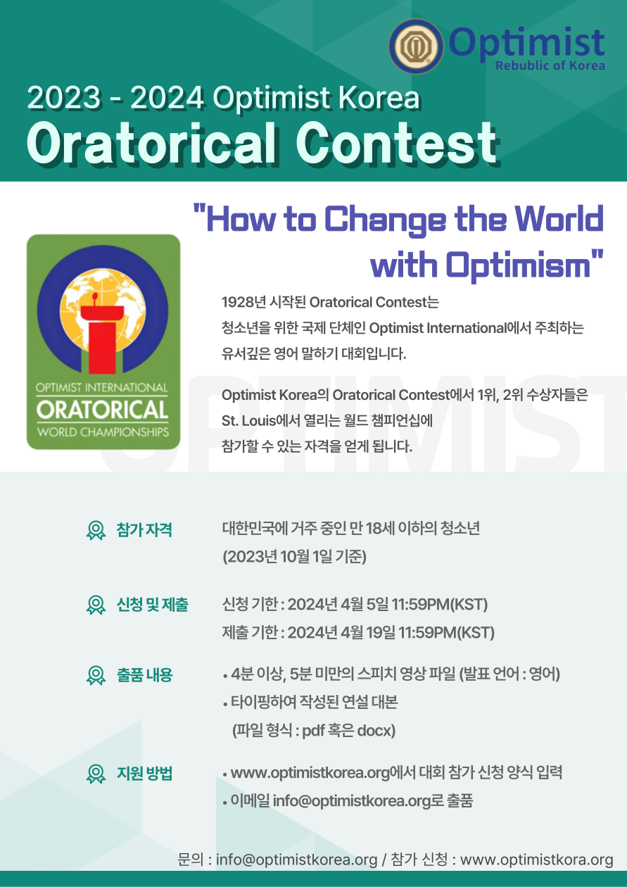 대회 규정 / 심사 기준 / 시상 등의 내용은 홈페이지 www.optimistkorea.org/speech에서 확인하실 수 있습니다.