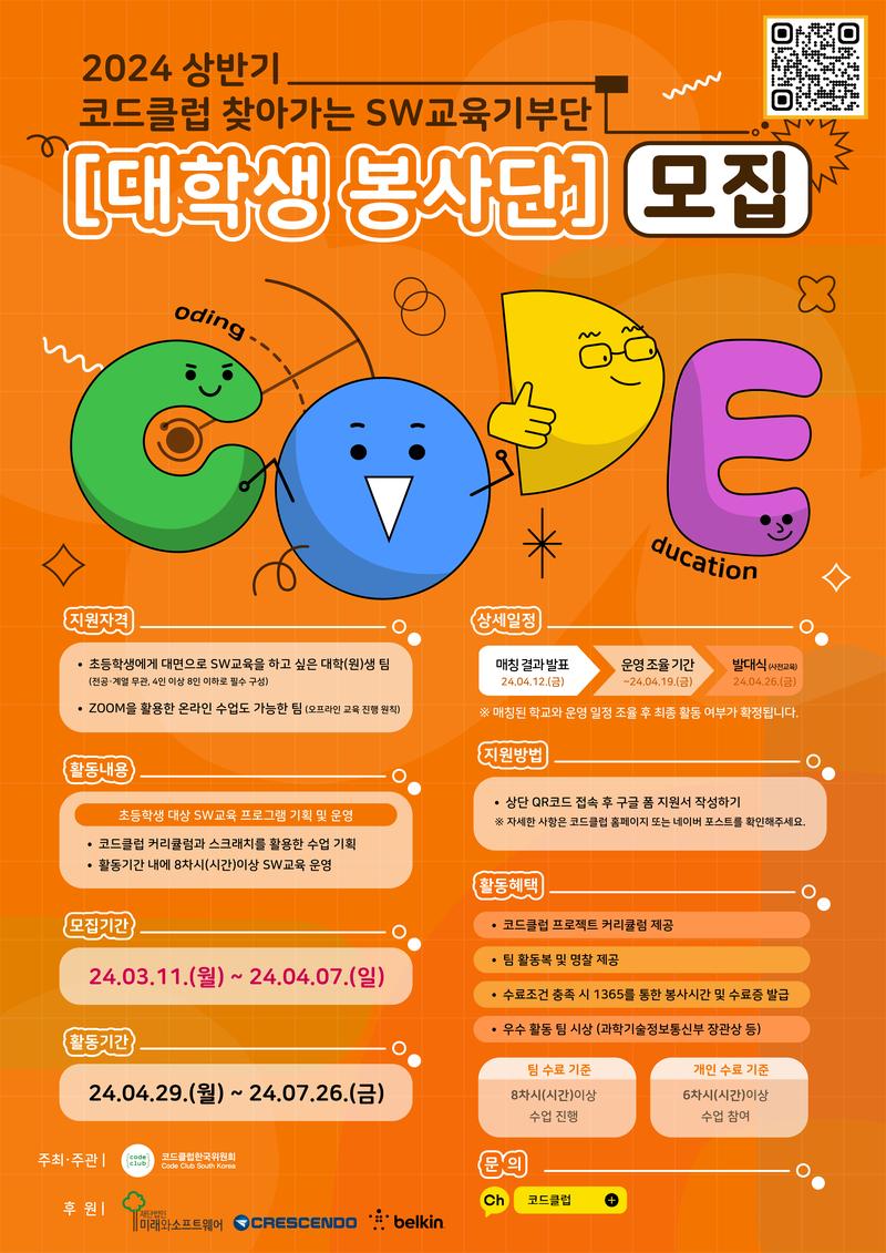 📣2024 상반기 코드클럽 찾아가는 SW교육기부단을 통해 SW교육 나눔을 실천할 대학생 봉사단을 모집합니다! 📣