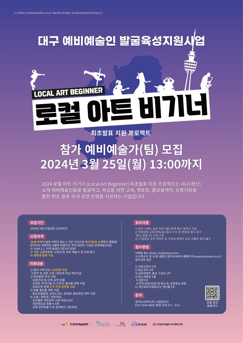 - 2024 로컬 아트 비기너(Local Art Beginner) 최초발표 지원 프로젝트는 대구(경산) 소재 예비예술인들을 발굴하고, 육성을 위한 교육, 멘토링, 홍보물 제작, 유통지원을 통한 최초 발표 무대 공연 진행을 지원하는 사업입니다.