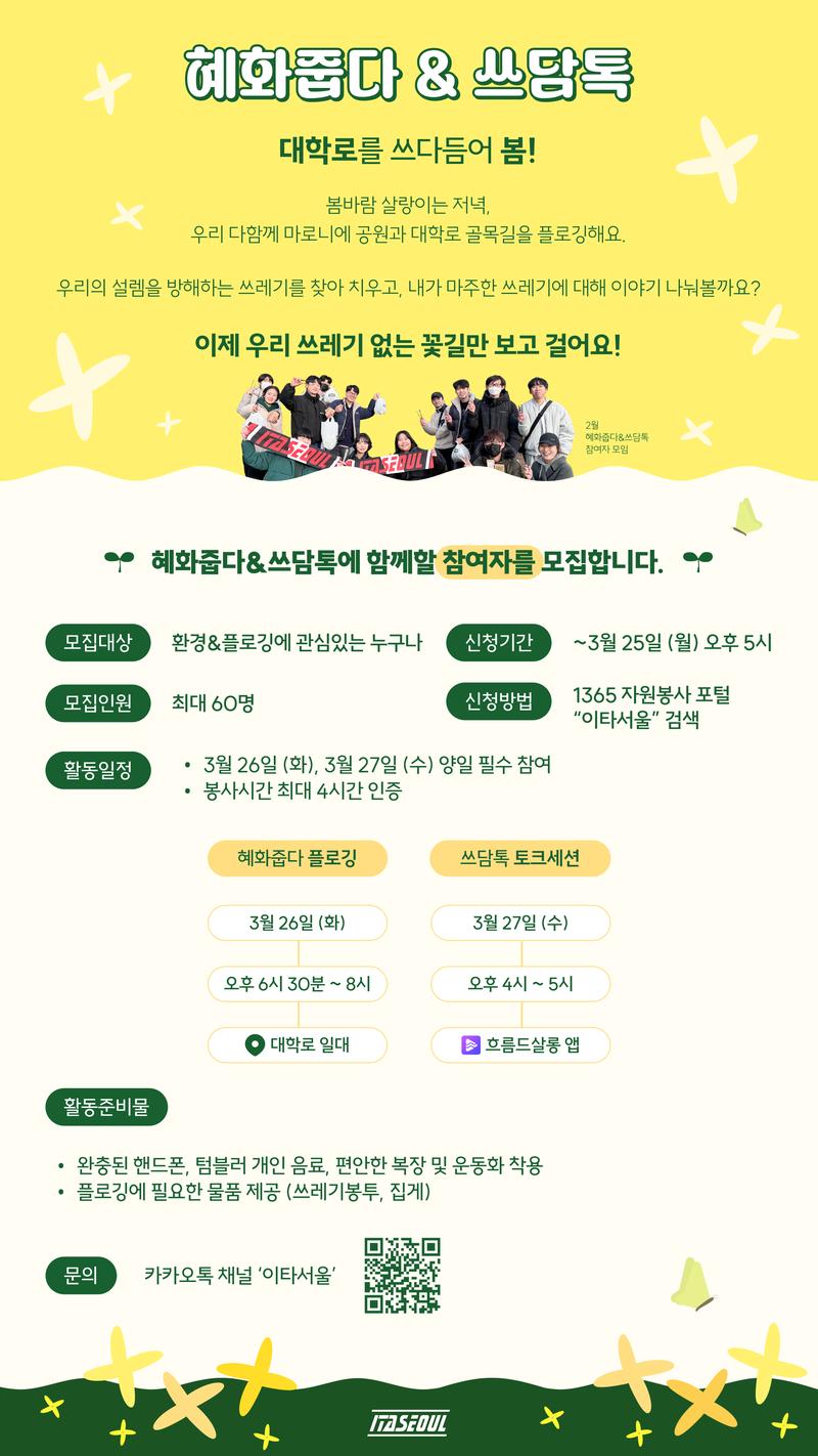 3월 혜화줍다&쓰담톡에 참여하실 봉사자분들을 모집합니다.