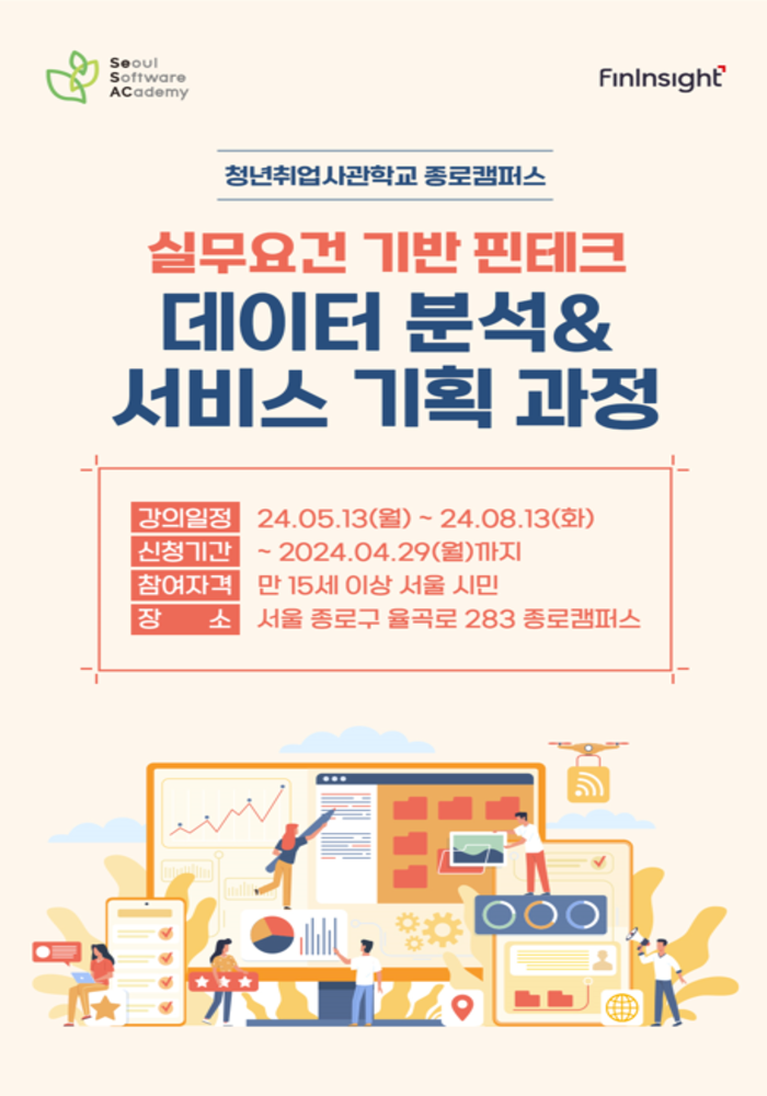 새싹 청년취업사관학교 종로캠에서 '실무요건 기반 핀테크 데이터 분석 & 서비스 기획 과정' 교육생을 모집합니다!