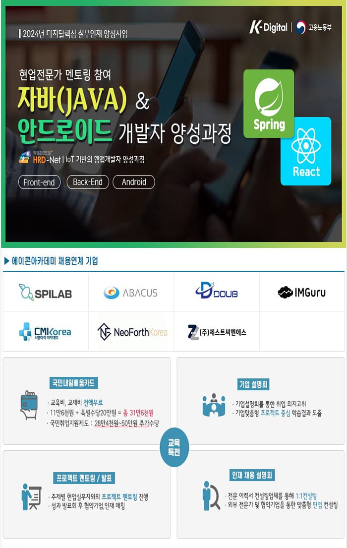 교육비용 : K-Digital 전액국비지원(국가기간.전략산업훈련 취업과정)