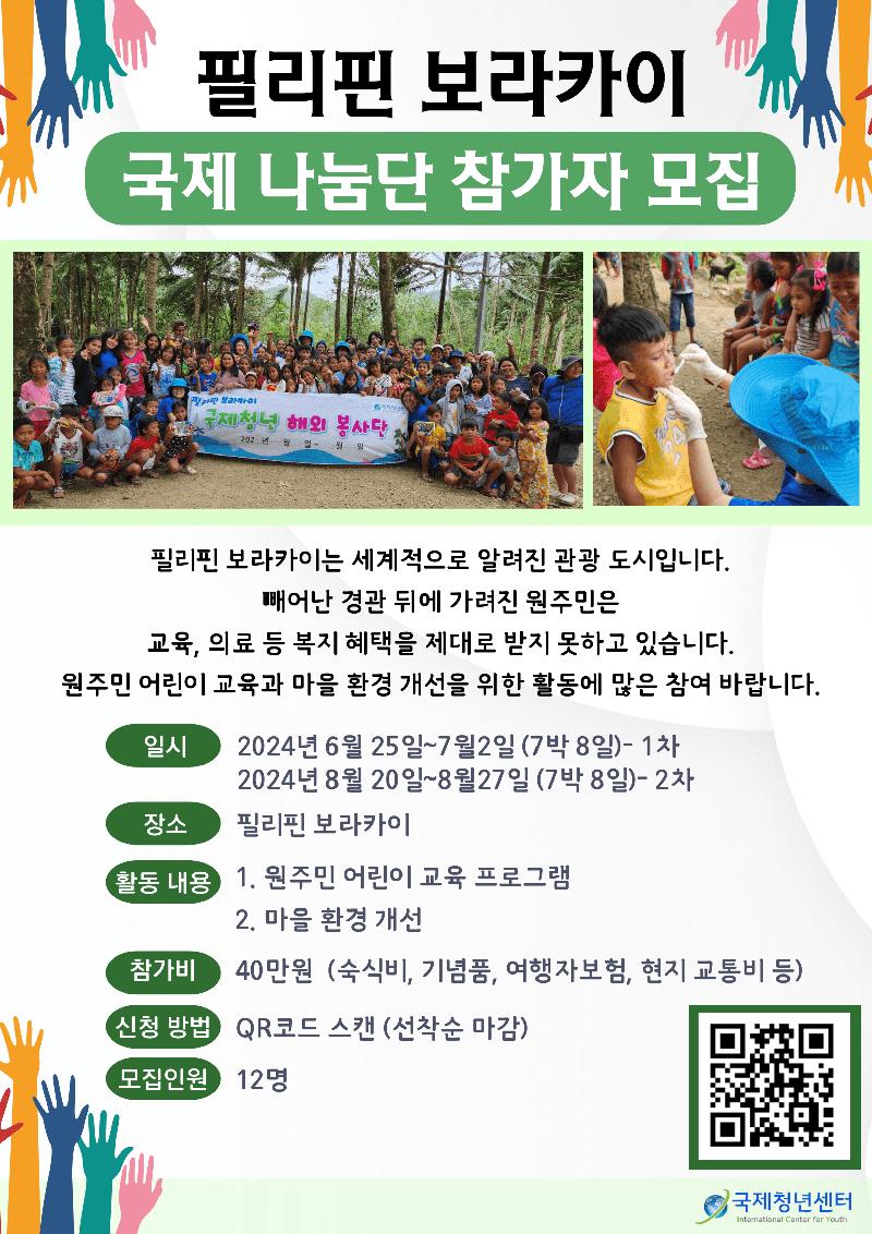 2024년 1월과 2월 보라카이를 방문하여 어린이 교육과 농구장 설치와 벽화 그리기 등 마을 환경 개선 활동을 펼쳤으며