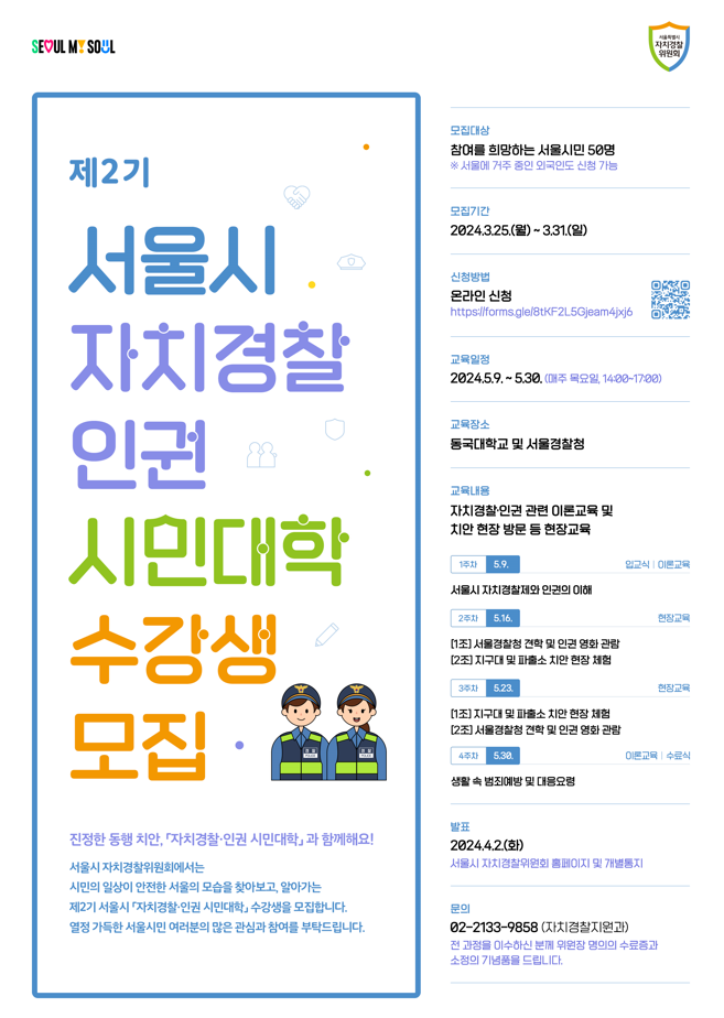 서울시 자치경찰위원회에서는 시민의 일상이 안전한 서울의 모습을 찾아보고, 알아가는 제2기 서울시 「자치경찰·인권 시민대학」 수강생을 모집하오니 열정 가득한 서울시민 여러분의 많은 관심과 참여를 부탁드립니다.