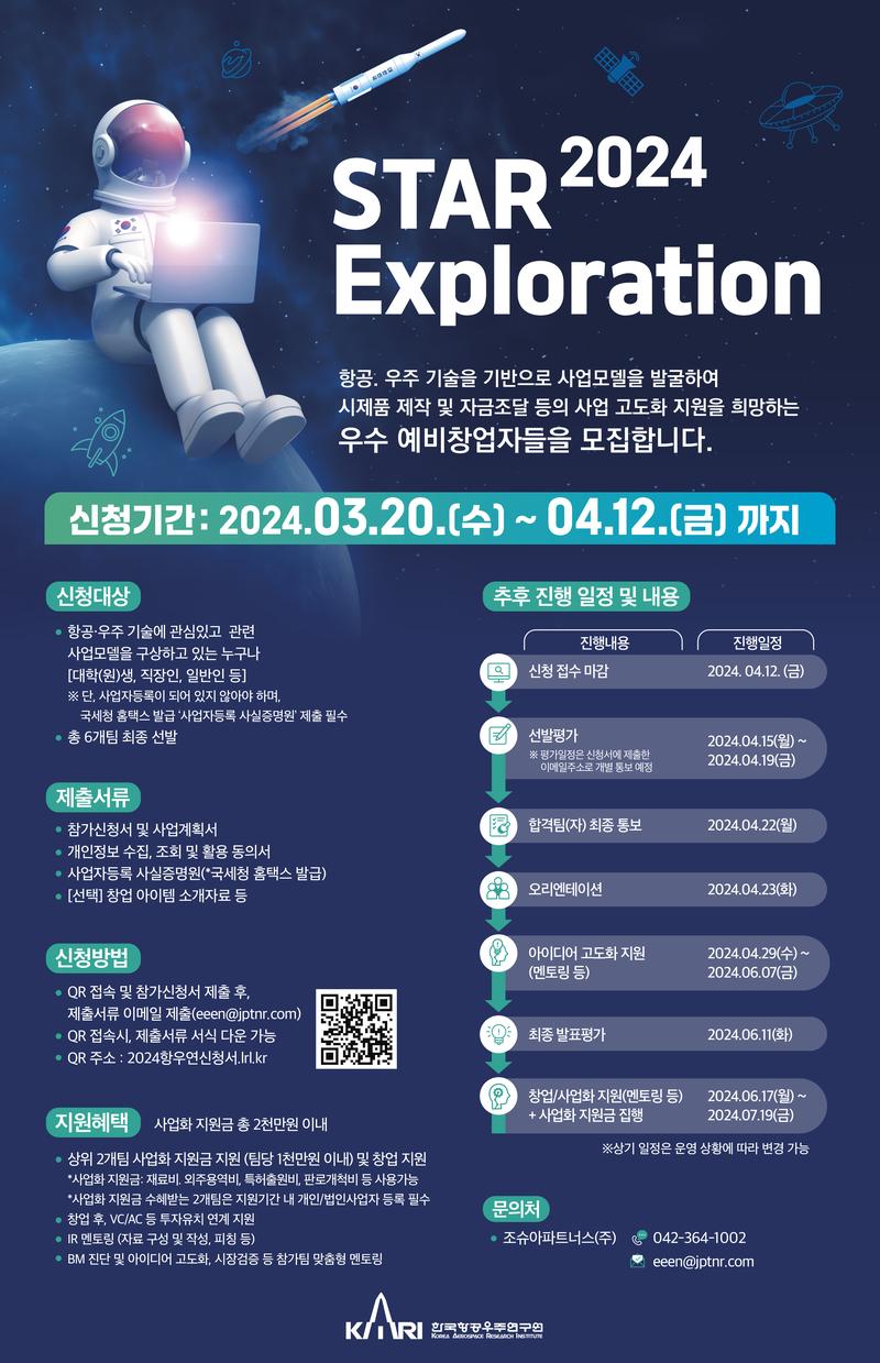 항공.우주 기술을 기반으로 사업모델을 발굴하여 시제품 제작 및 자금조달 등의 사업 고도화 지원을 희망하는 우수 예비창업자들을 모집합니다.