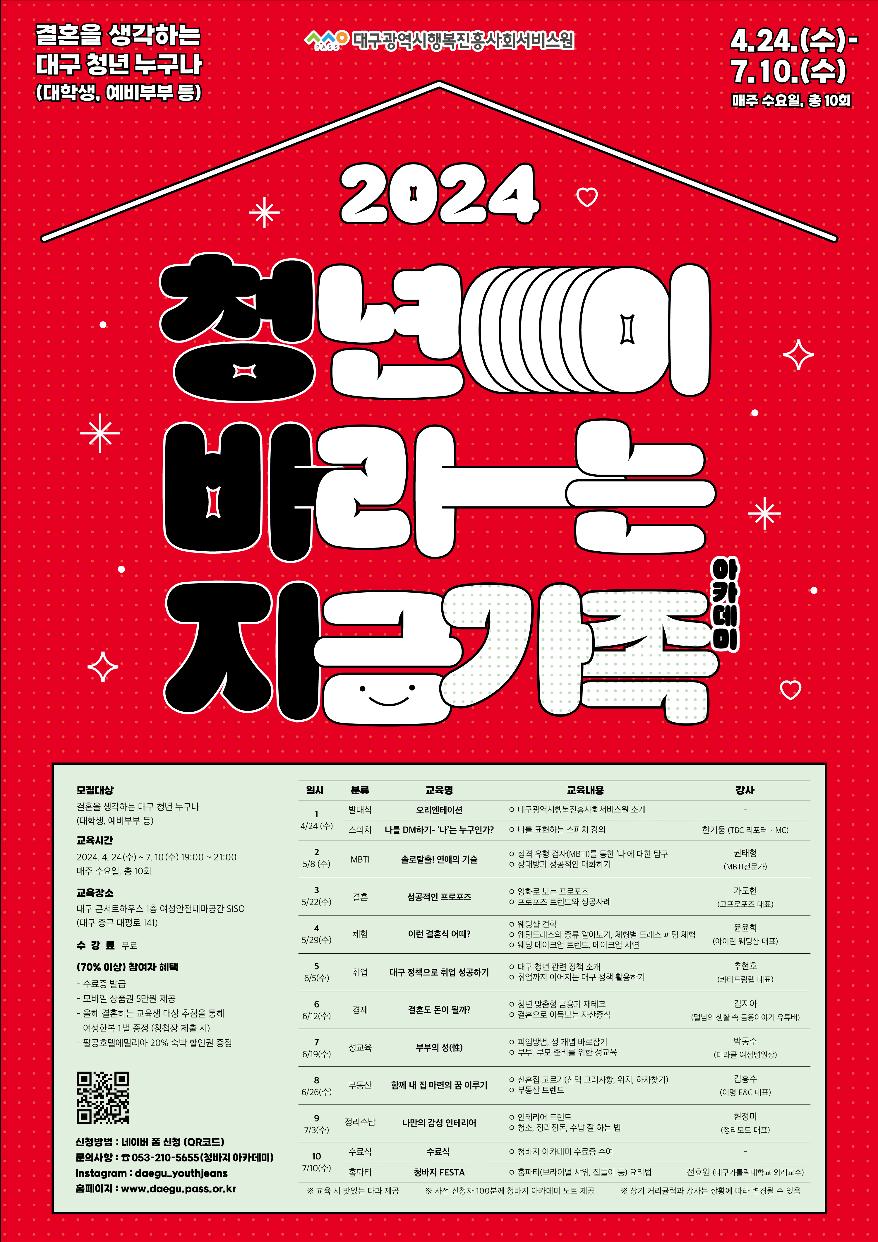 - 결혼과 출산, 가족에 대한 긍정적 이미지를 형성하고자 청년이 바라는 지금 가족(청바지) 아카데미를 진행하오니 관심있는 대구 시민들의 많은 참여 바랍니다.
