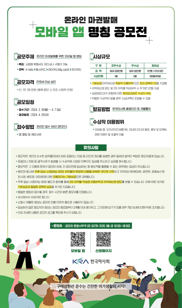 * 응모작에 대한 일체의 법적 책임은 응모자에게 있으며, 수상 후 제3자의 권리 침해 등 분쟁 발생 시 한국마사회는 책임을 지지 않음