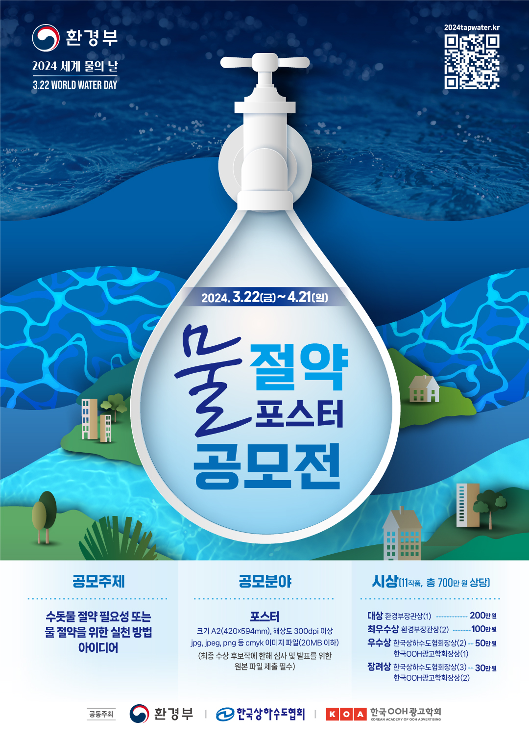 2024년 세계 물의 날을 맞이하여 환경부, 한국상하수도협회, 한국OOH광고학회가 함께 물 절약 포스터 공모전을 개최합니다!