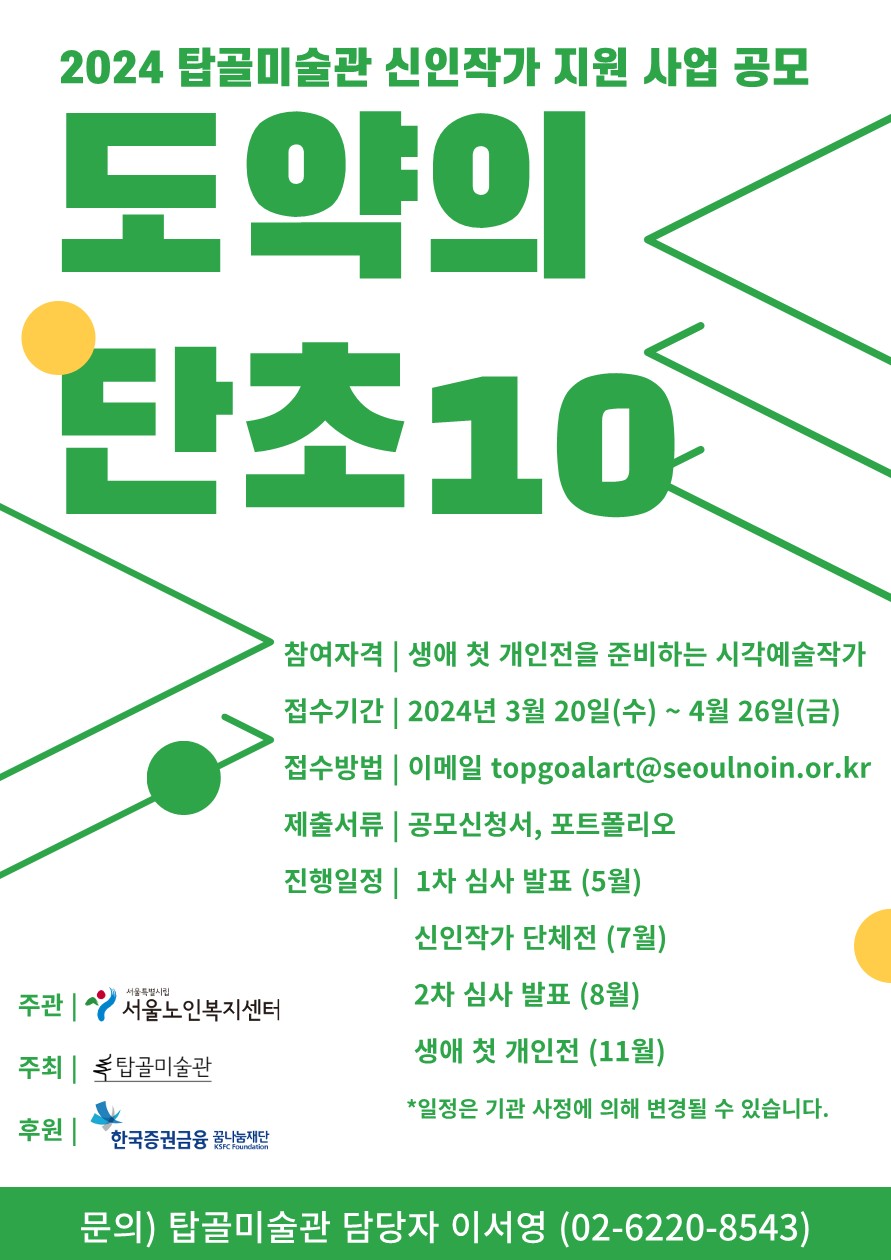 탑골미술관에서는 현대예술을 이끌어 갈 신인 작가 지원을 위해 <도약의 단초10> 공모접수를 4월 26일(금)까지 진행하오니 신인작가들의 많은 관심과 참여 부탁드립니다.
