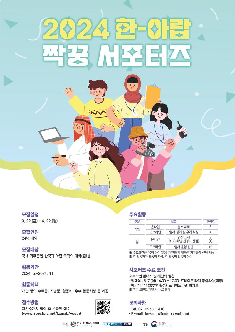 7. 활동혜택 : 재단 명의 수료증, 기념품, 소정의 개인 활동비, 우수 개인 서포터즈 상금 8. 문의사항 : 02-6953-1410 / ko-arab@contestweb.net ※ 한국-아랍소사이어티 (KAS) 홈페이지 : http://www.korea-arab.org/