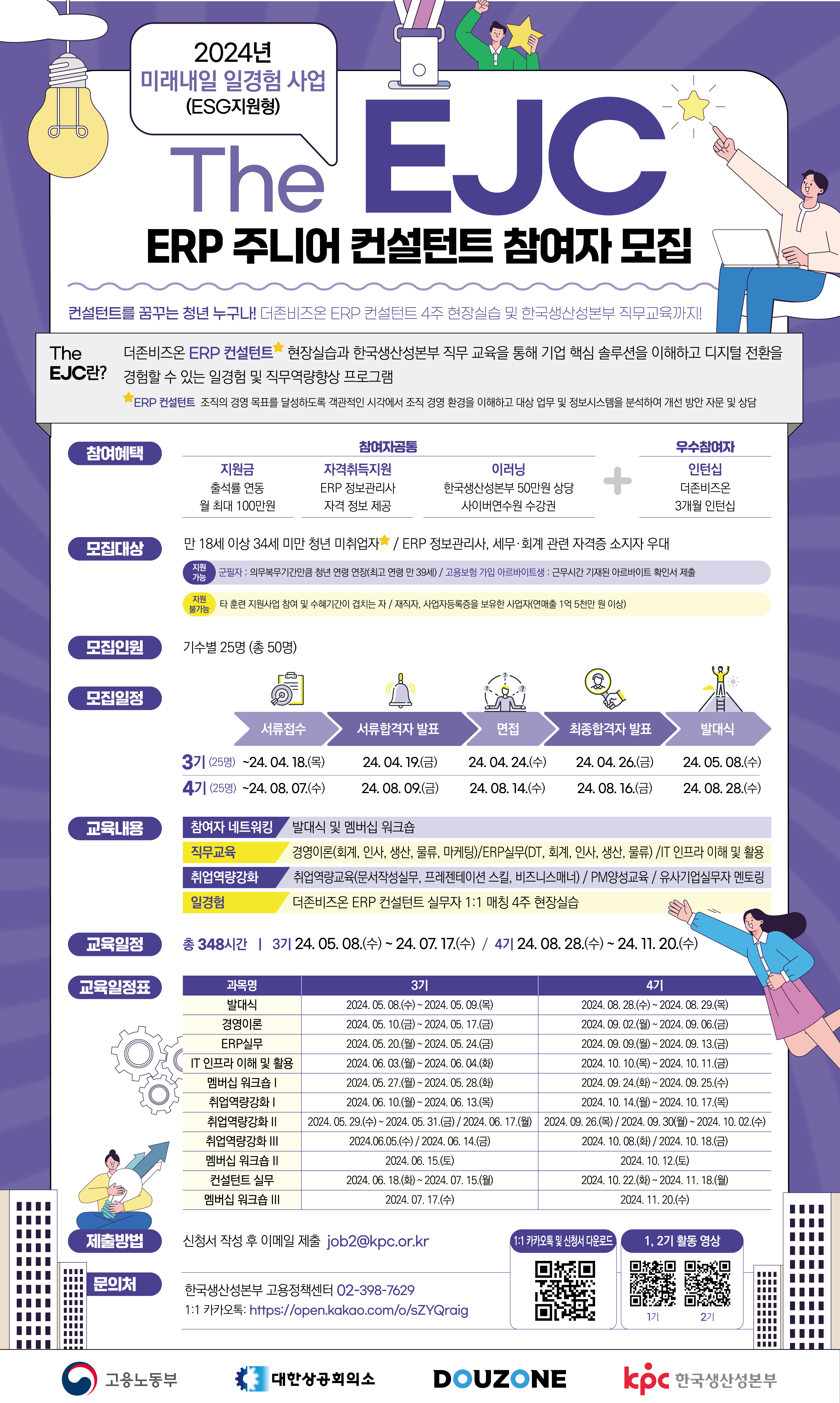 더존비즈온 ERP 컨설턴트* 현장실습과 한국생산성본부 직무 교육을 통해 기업 핵심 솔루션을 이해하고 디지털 전환을 경험할 수 있는 일경험 및 직무역량향상 프로그램