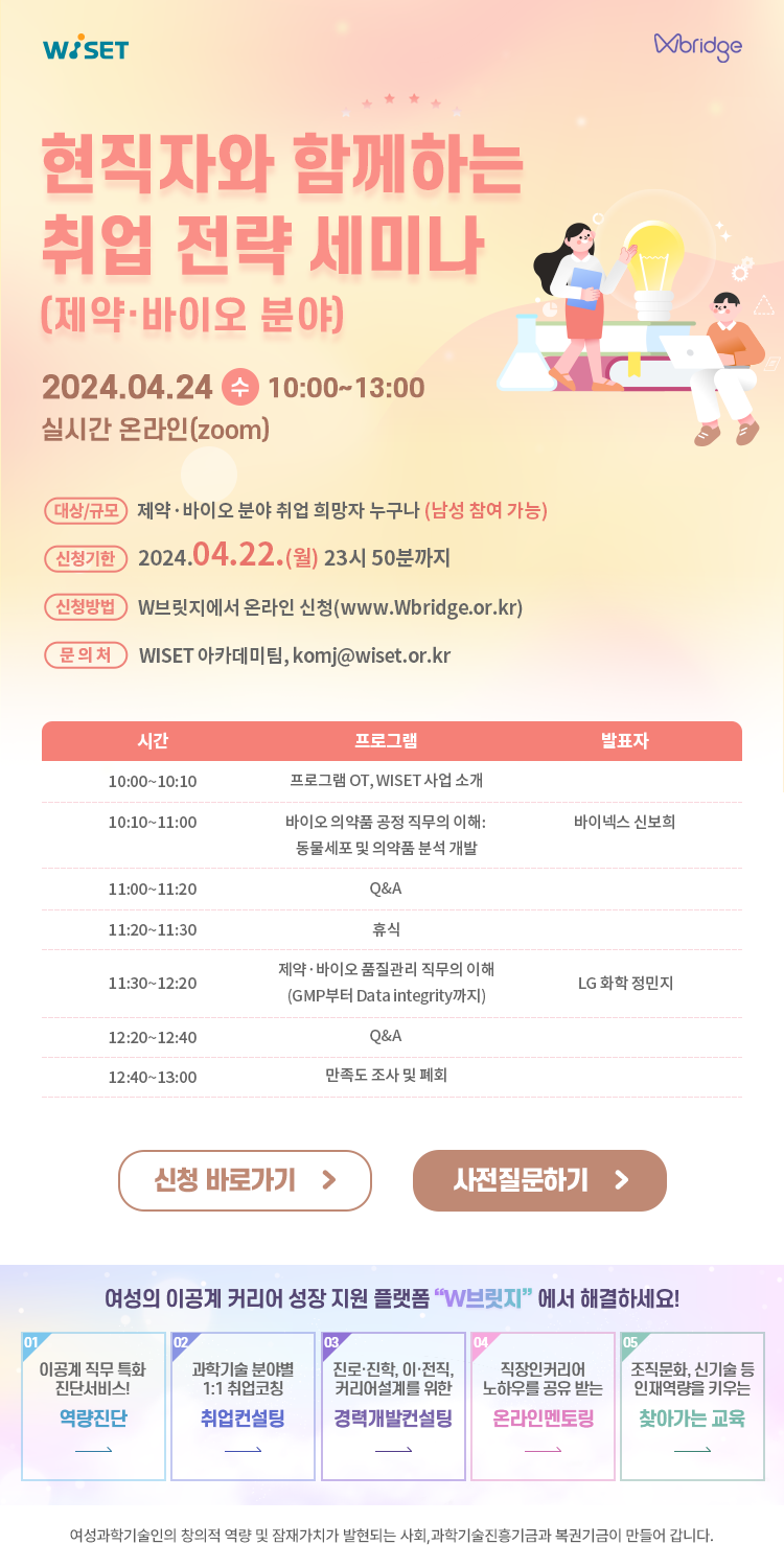 한국여성과학기술인육성재단은 제약·바이오 분야 현직자와 함께하는 취업 전략 세미나를 개최하오니 많은 신청 바랍니다.