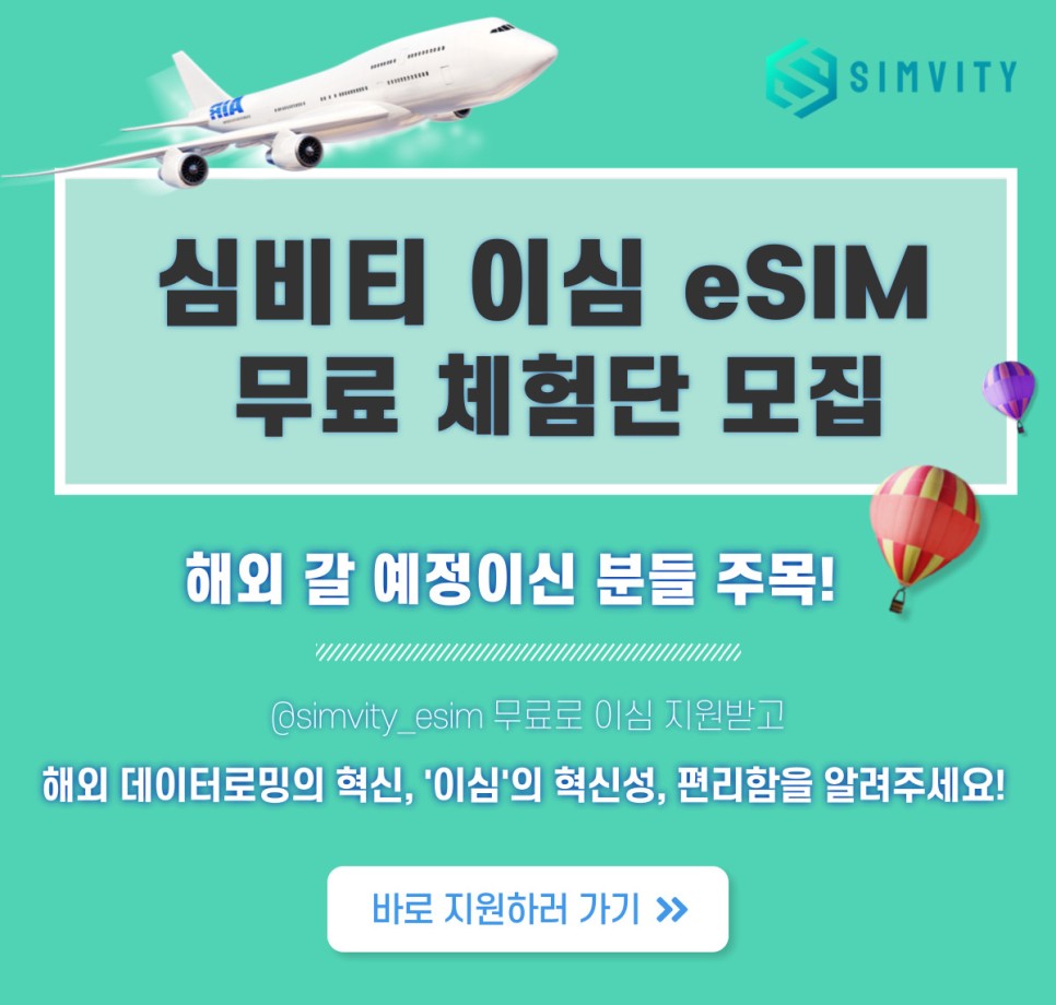 안녕하세요. 전세계 250개국을 커버하는, 140개 이동통신사의 "로컬 eSIM"을 최다 보유하고 있는 글로벌 이심 전문 브랜드, SIMVITY 입니다. 기술력을 인정받아 국내 데이터로밍 업계 최초로, 유럽 최대 기술 테크 행사인 VIVA TECH에 참가 기업으로 선정되기도 했어요🎊 이번에 국내 채널 론칭을 기념하여 여러 파격적인 이벤트를 진행하고 있으니 많은 관심과 사랑 부탁드려요♥