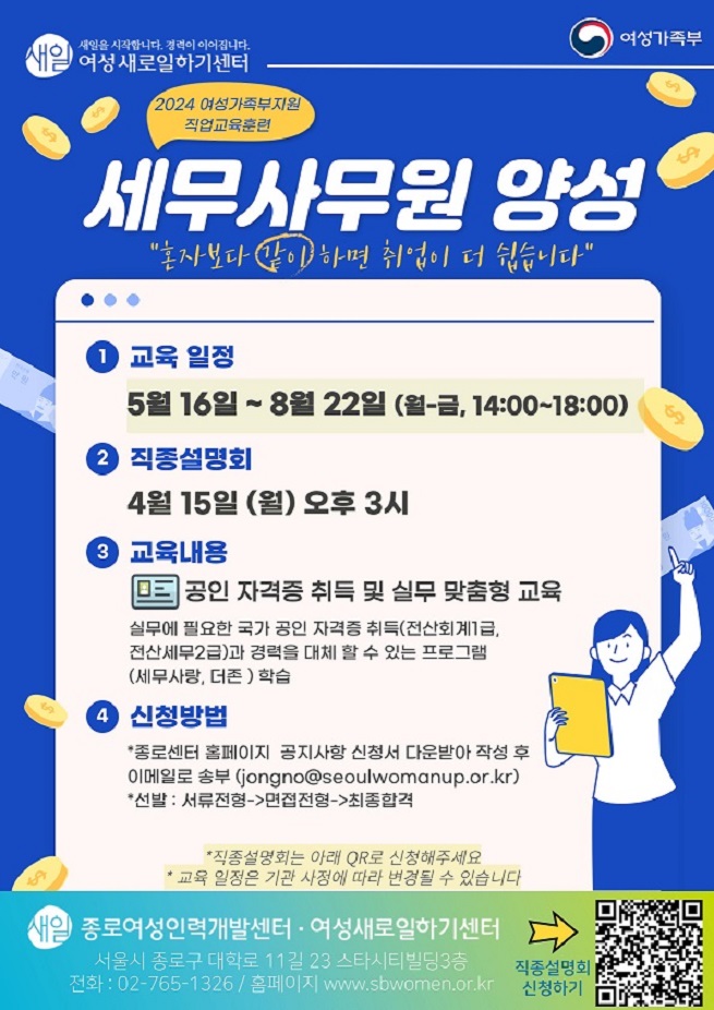 세무사사무실 취업을 희망하는 미취업 구직여성(경리,회계 관련 전공 및 경력자 우대)