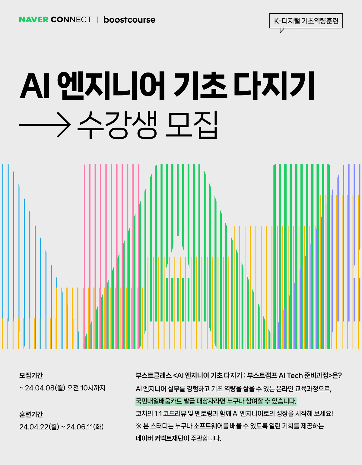 네이버 커넥트재단이 주관하는 인공지능 기초 역량 강화 교육 프로그램으로, 국민내일배움카드 대상자라면 누구나 참여할 수 있습니다.