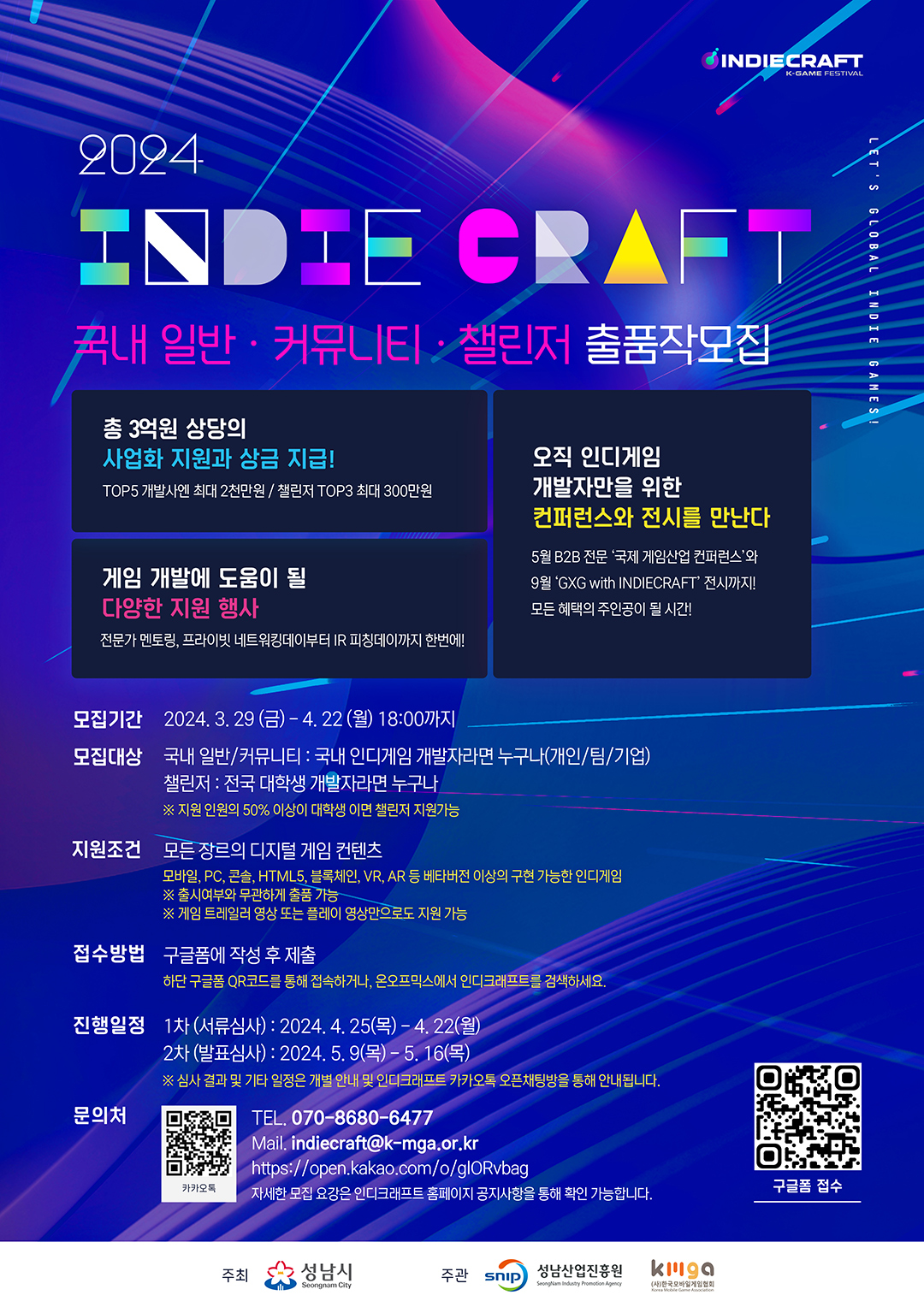 대한민국 대표 인디게임 축제, '2024 인디크래프트'가 드디어 우수 개발사 선발을 위한 모집을 시작합니다!
