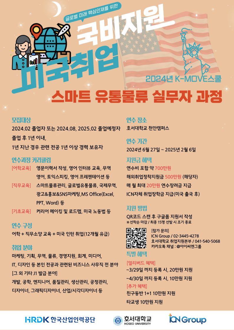 : 국비지원으로 어학+직무+미국 인턴십 준비를 학과 수업과 연수 과정을 병행하며 공백기 없이 바로 취업 가능한 프로그램으로서 한국산업인력공단 월드잡플러스에서 주관하는 해외취업 프로그램