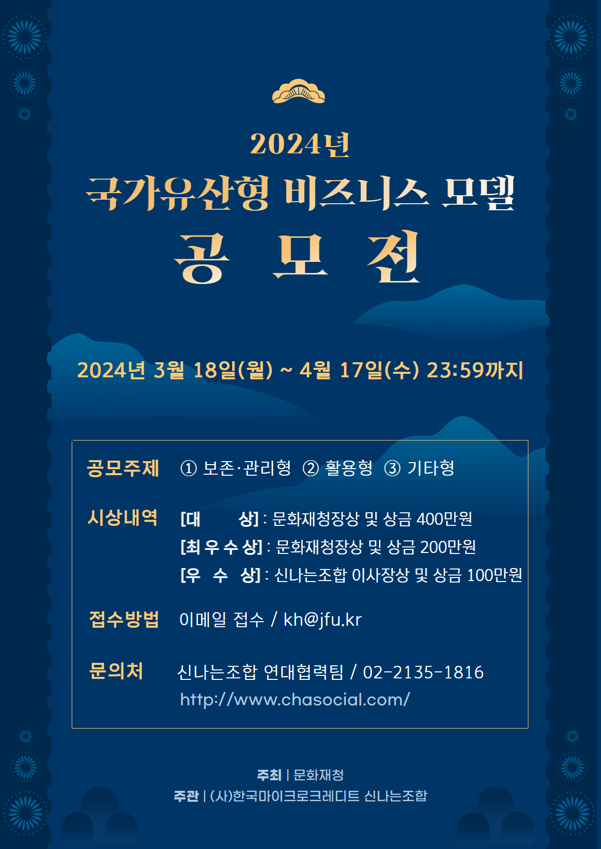 문화재청과 (사)한국마이크로크레디트 신나는조합이 함께 ‘2024년 국가유산형 사회적경제 비즈니스 모델 공모전’을 개최합니다. 국가유산 보존 및 관리, 활용 등 우리 국가유산과 관련하여 혁신적인 아이디어를 가진 많은 분들의 관심과 참여를 부탁드립니다.