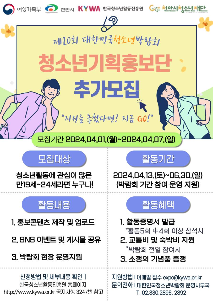 청소년의 능동적이고 자주적인 주인의식을 높이고 대한민국 국민의 청소년 육성 참여 분위기 조성을 위한 2024년 제20회 대한민국청소년박람회의 청소년 기획 홍보단을 모집합니다.
