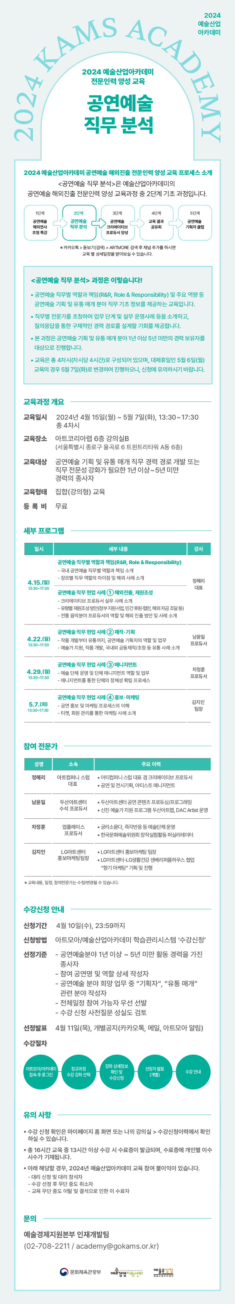 - 교육대상: 공연예술 기획 및 유통 매개 직무 경력 경로 개발 또는 직무 전문성 강화가 필요한 1년 이상~5년 미만 경력의 종사자