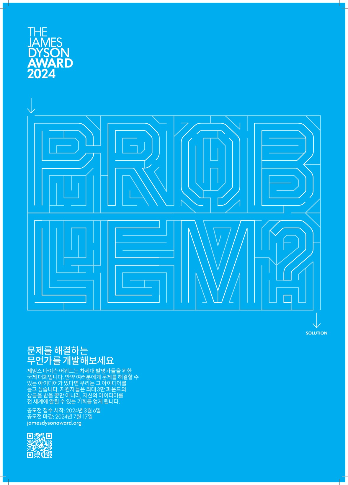 국내에서는 9회를 맞이한 제임스 다이슨 어워드(James Dyson Award)는 차세대 엔지니어들에게 영감을 주고 계속해서 연구, 개발을 할 수 있도록 장려하기 위해 글로벌 기술 기업 다이슨에서 매년 진행하는 국제 엔지니어링 및 디자인 공모전입니다. 일상에서 마주하는 크고 작은 문제에 대해 ‘이렇게 해결하면 어떨까?’하고 아이디어가 마구 샘 솟는 분들, 톡톡 튀는 아이디어를 실현하는 과정에 흥미를 느끼는 분들, 주저하지 마시고 제임스 다이슨 어워드 2024에 지원하세요. 여러분들의 창의적인 아이디어를 기다립니다!