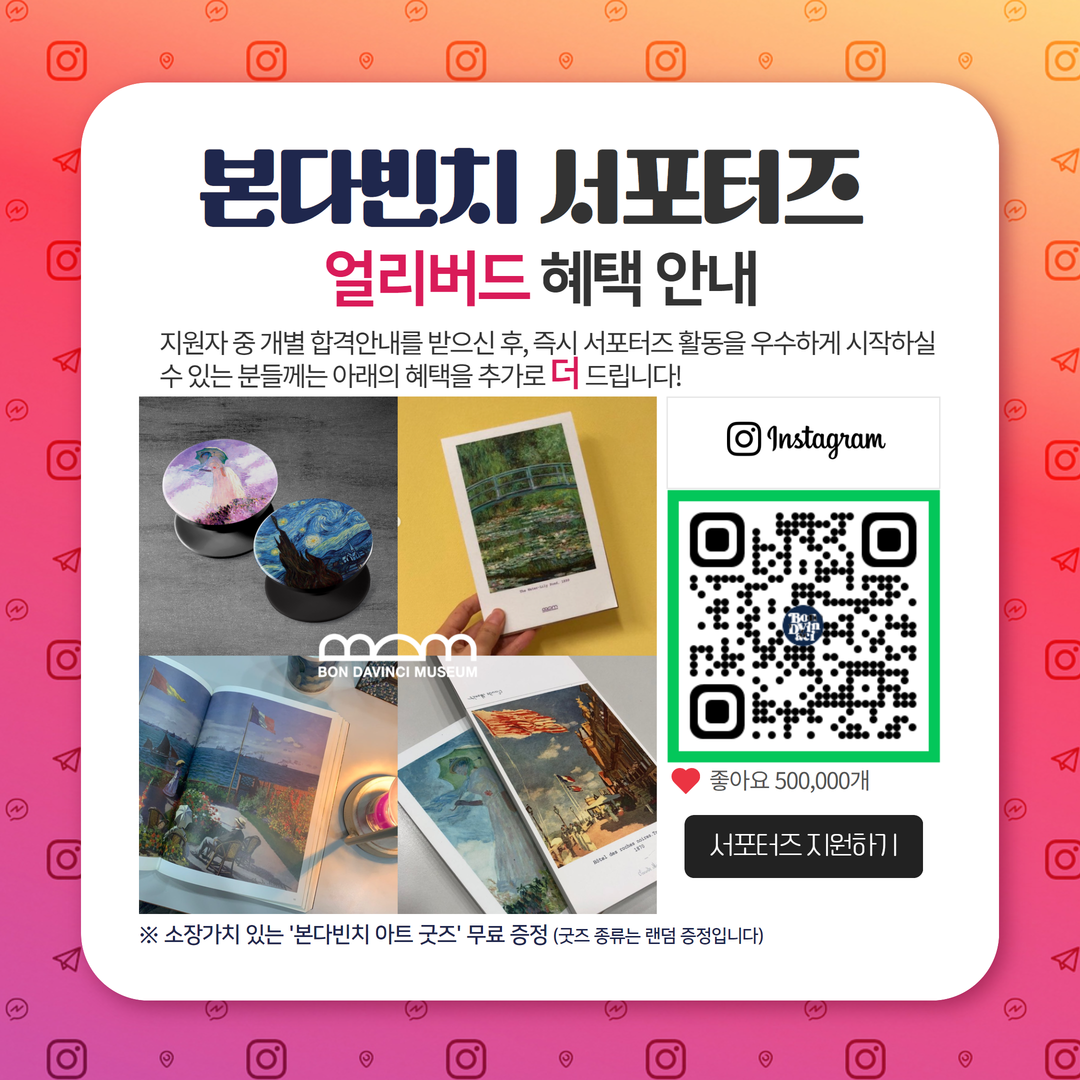 - 서포터즈 활동 기간 중 본다빈치 전시 프리패스권 제공 (본인포함 동반 1인)