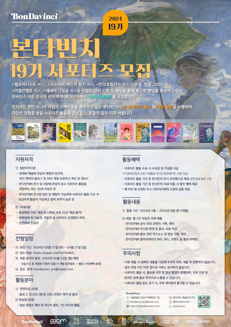 <헬로아티스트 展>, <르누아르 여인의 향기 展>, <반고흐빌리지 展>, <모네, 빛을 그리다 展>, <미켈란젤로 展>, <헤세와 그림들 展>등 수 많은 전시 기획 및 제작을 통해 확고한 팬덤을 형성하고 있는 컨버전스 아트 전시의 선두 주자 본다빈치에서 서포터즈를 모집합니다.