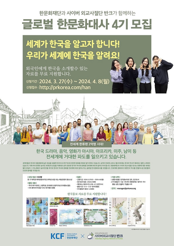 한문화재단과 사이버외교사절단 반크는 한류에 대한 세계인들의 관심이 그 어느 때보다 높아진 것을 계기로 한국의 역사와 문화를 전세계에 바로 알려나가는 '글로벌 한국문화대사'를 모집합니다.