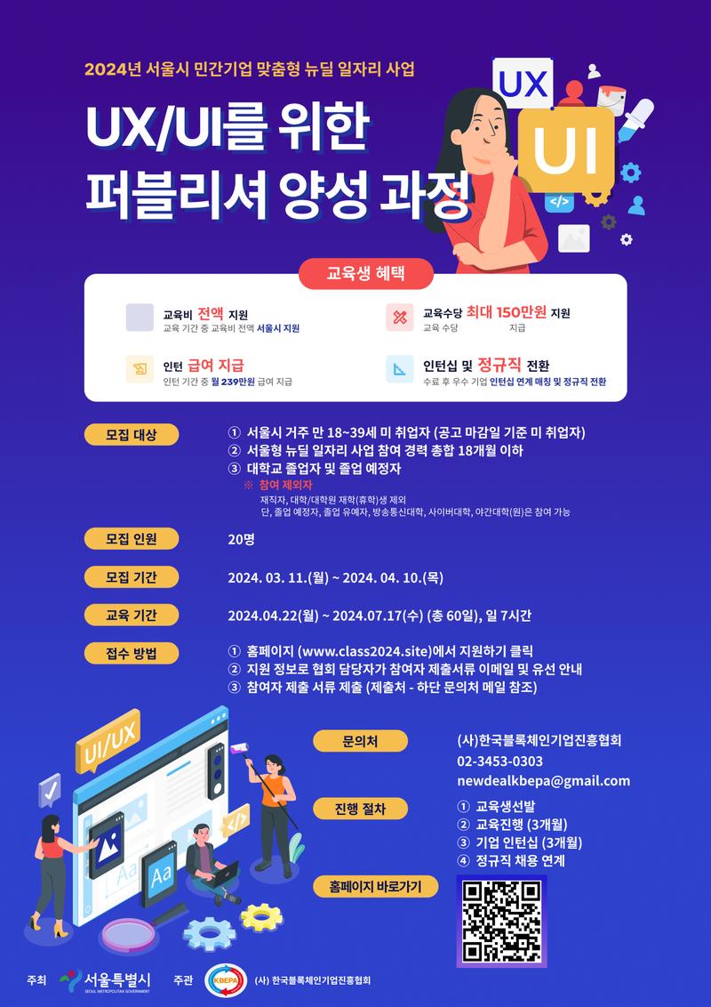 서울시에서 주최하는 2024 뉴딜 일자리 사업의 일환으로 UI/UX 퍼블리셔 양성 과정의 지원자를 모집합니다.