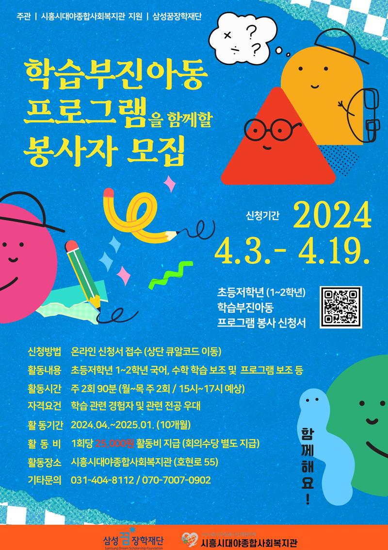 시흥시대야종합사회복지관에서는 삼성꿈장학재단의 지원으로 초등저학년(1~2학년) 학습 부진 아동의 기초학습(읽기,쓰기,수학)과 사회성 향상을 위한 우주선 : 우리가 주인공이 되는 선물 같은 시간 프로그램을 진행합니다.