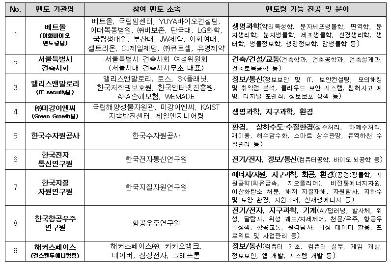 * 멘토 소속 : CJ제일제당, JW제약, LG화학, SK플래닛, 국립생태원, 국립암센터, 국립해양생물자원관, 네이버, 삼성전자, 서울특별시 건축사회, 셀트리온, 카카오뱅크, 크래프톤, 토스, 한국수자원공사, 한국전자통신연구원, 한국지질자원연구원, 한국항공우주연구원 등