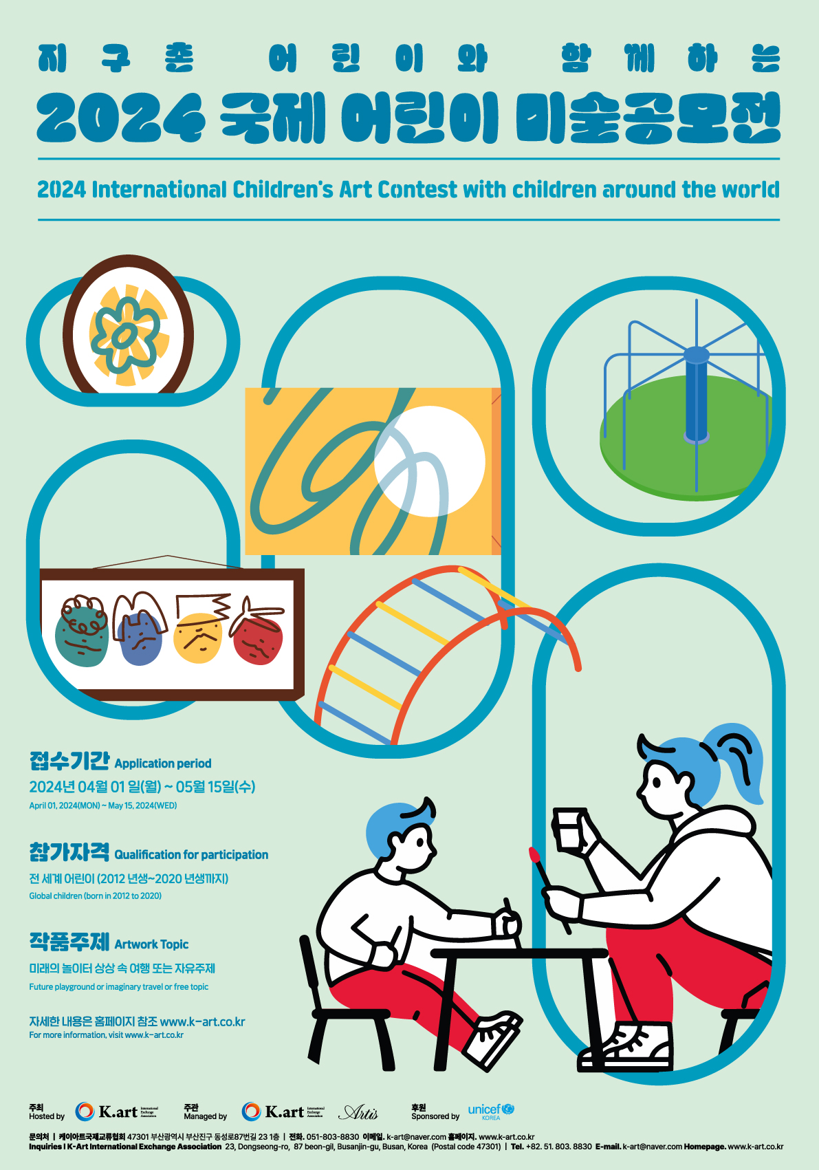 전 세계 어린이들에게 예술의 창의성을 펼칠 수 있는 장을 제공하여 잠재되어 있는 예술성을 평가받 고 미술 교육의 흐름을 파악할 수 있는 기회 본 공모전에서 선발된 어린이들은 본회에서 주최하는 인도, 일본 등 여러 나라의 예술, 문화 교육을 직접 체험할 수 있는 국제 교류 축제 프로그램, 국내외 연수 및 미술 강좌에 참가 기회를 제공함으로 써 어린이 들의 예술 견문을 넓힐 수 있는 기회 선발된 어린이들은 수상작 중 각 분야 대상 수상작품에 대해 올12월에 개최되는 부산국제아트페어 기획 그룹전 특별 초대전시