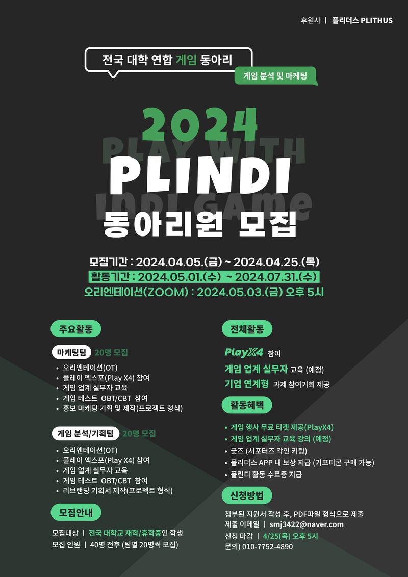 플린디(PLINDI)는 게임을 좋아하고, 마케팅, 게임 분석, 기획에 관심 있는 사람들이 ‘온라인’으로 모여 프로젝트를 진행하며 포트폴리오를 만들어 가는 동아리입니다.
