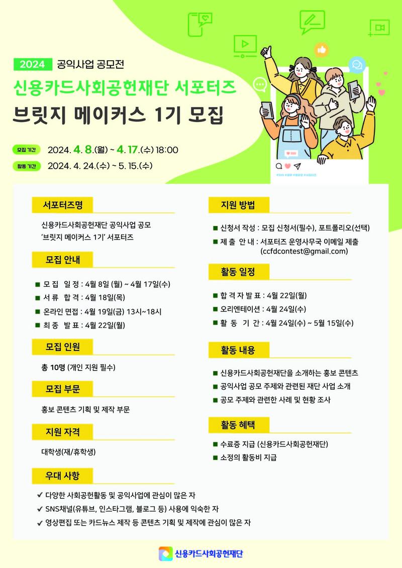 신용카드사회공헌재단에서 공익사업 공모전 홍보 서포터즈 ‘브릿지 메이커스’ 1기를 모집합니다.누구나 안전하고 편리한 신용사회의 혜택을 누릴 수 있는 따뜻한 희망사회 구현을 위한 출발선에서 여러분을 기다리고 있겠습니다!