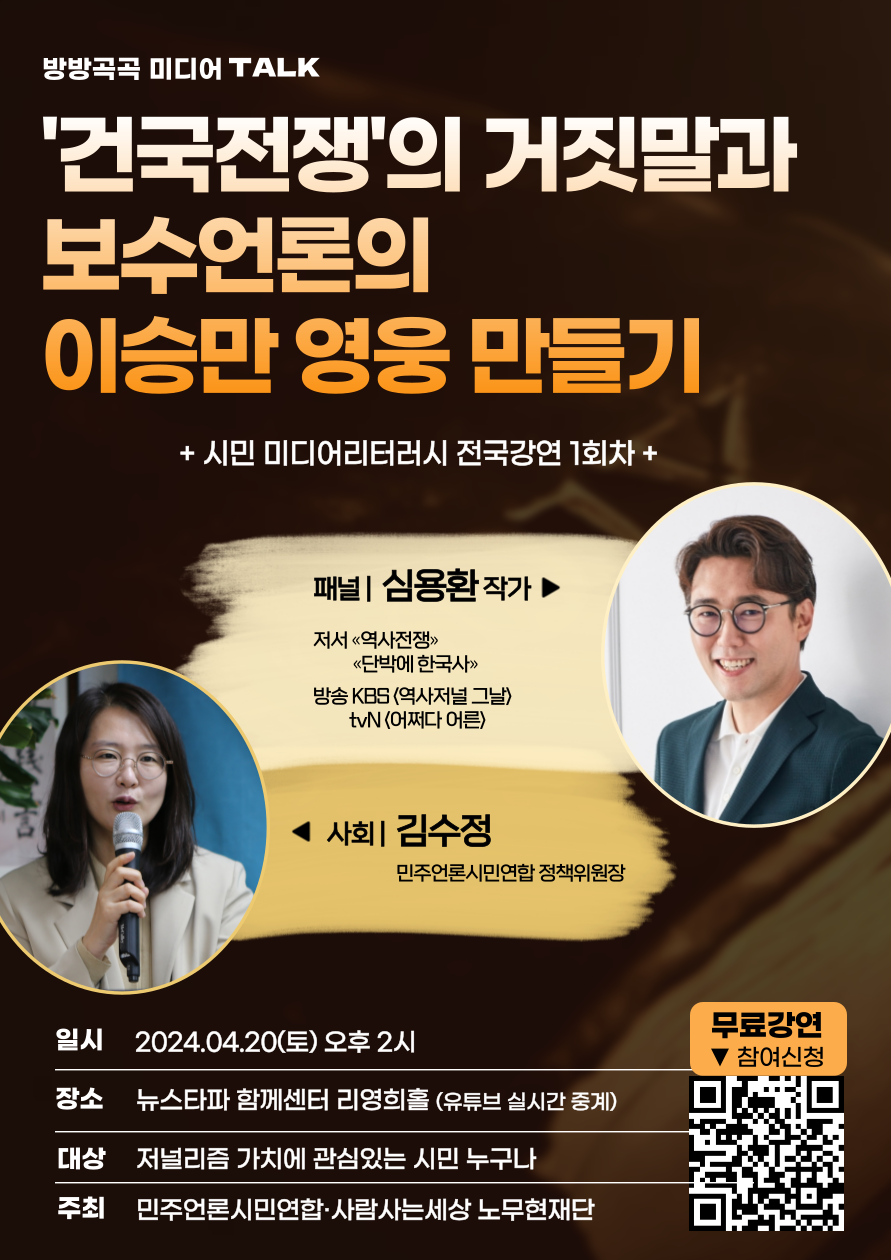 📍첫 회차 <‘건국전쟁’의 거짓말과 보수언론의 이승만 영웅 만들기>는 4월 20일(토) 오후 2시 뉴스타파 함께센터 리영희홀에서 진행됩니다. 김수정 민언련 정책위원장이 사회를 맡아 심용환 작가·역사학자와 대담합니다. 영화 ‘건국전쟁’에 나타난 역사왜곡의 면면을 짚고, 건국전쟁 띄우기·이승만 미화에 나선 보수언론의 속내를 알아보는 자리가 될 것입니다. 김수정 민언련 정책위원장의 보수언론의 보도분석과 더불어 «단박에 한국사», «역사전쟁», «혐오와 왜곡, 감정싸움없이 한국사를 이야기하는 법»으로 한국사와 역사논쟁을 다뤄온 김용환 역사학자의 깊이 있는 해석을 더해 풍성한 이야기가 펼쳐집니다.