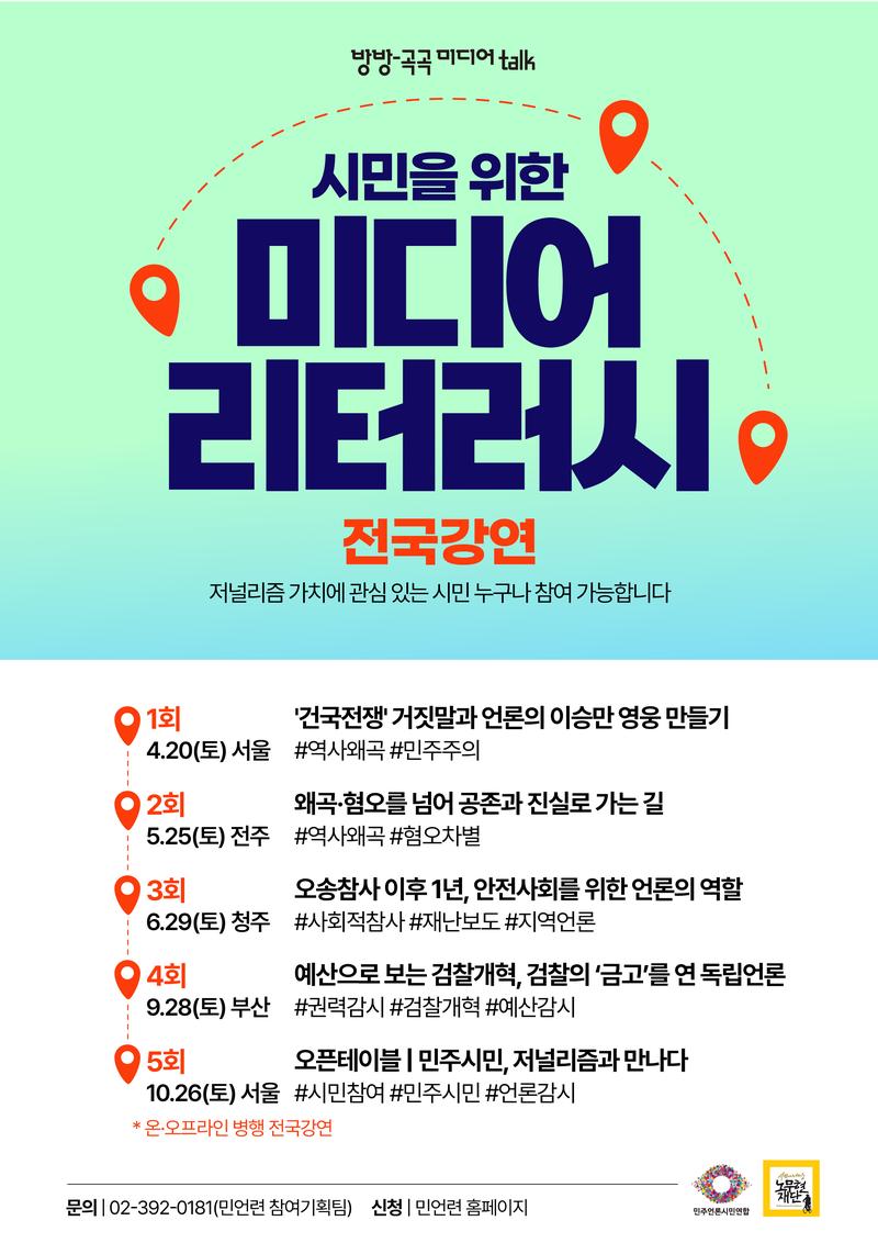 2024년 민주언론시민연합이 한국사회의 위기를 최일선에서 고민하는 저널리스트, 시민사회단체 구성원과 함께 전국 방방곡곡 시민을 찾아갑니다. 강연에는 민주주의 주요 토대인 '미디어를 바로 보는 눈'을 키우고 싶은 시민 누구나 참여 가능합니다.