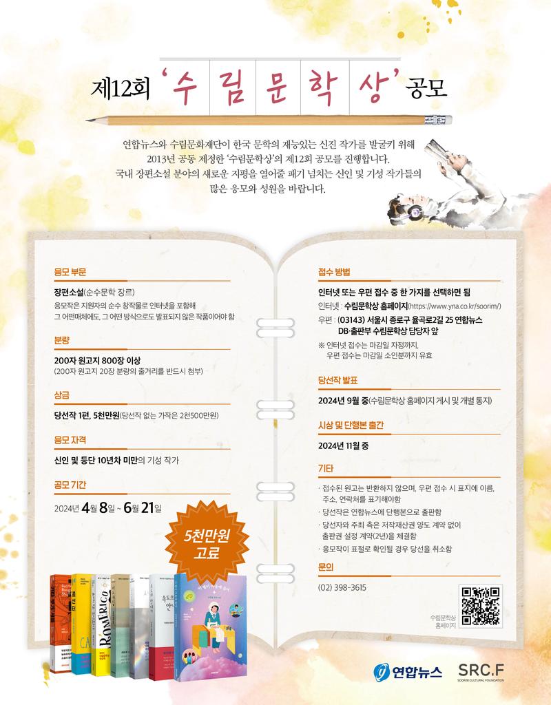 국가기간뉴스통신사인 연합뉴스와 (재)수림문화재단은 한국 문단의 미래를 열어갈 재능있는 작가를 발굴키 위해 ‘수림문학상’을 제정하고 한국 장편 소설의 지형을 바꿔 놓을 패기 넘치는 신인 및 기성 작가들의 응모를 기다립니다.