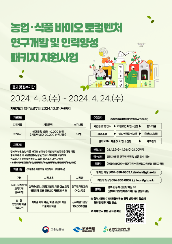 - (재)경북바이오산업연구원에서는 연구원을 위한 R&D인력양성 교육지원과 산ㆍ연 협업과제를 지원하는「2024년 농업ㆍ식품 바이오 로컬벤처 연구개발 및 인력양성 패키지 지원 사업」을 추진하오니, 경북 북부권 내 기업의 많은 참여 바랍니다.
