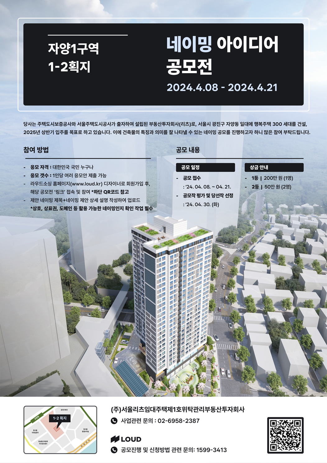 -서울시 광진구 자양동 일대에 행복주택 300세대를 건설, 2025년 상반기 입주를 목표로 하고 있습니다. 이에 건축물의 특징과 의미를 잘 나타낼 수 있는 네이밍 공모를 진행코자 하오니 많은 참여 부탁드립니다.
